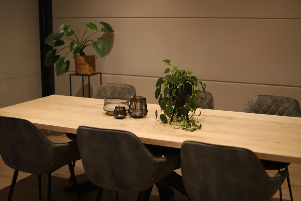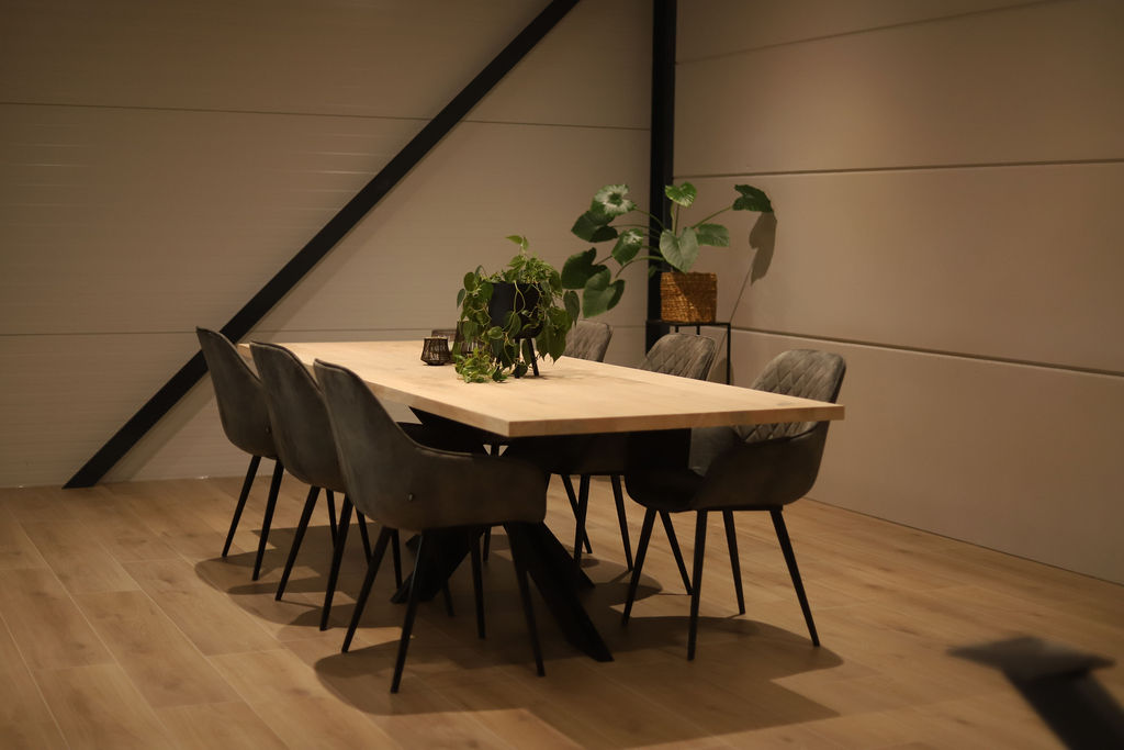 De tafel is voorzien van een zwart stalen spinpoot-onderstel in een robuuste 10×5 kokerprofiel. Dit krachtige onderstel zorgt niet alleen voor optimale stabiliteit, maar biedt ook veel beenruimte rondom de tafel. De combinatie van het warme eikenhout en het strakke stalen frame geeft de tafel een stoer en eigentijds karakter.