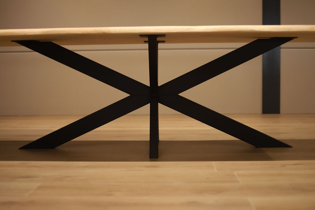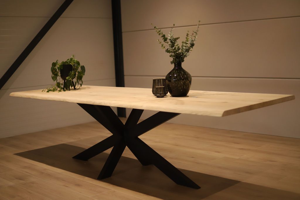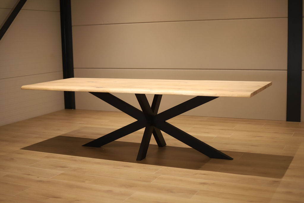 De tafel is voorzien van een zwart stalen spinpoot-onderstel in een robuuste 10×5 kokerprofiel. Dit krachtige onderstel zorgt niet alleen voor optimale stabiliteit, maar biedt ook veel beenruimte rondom de tafel. De combinatie van het warme eikenhout en het strakke stalen frame geeft de tafel een stoer en eigentijds karakter.