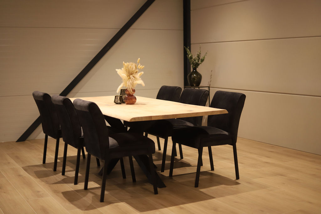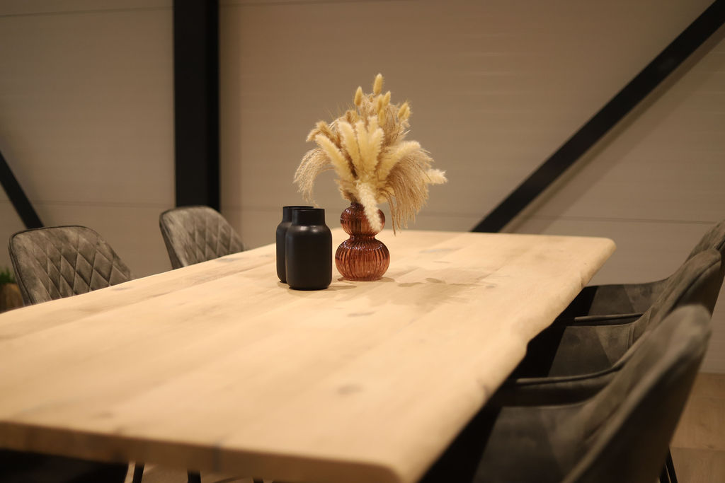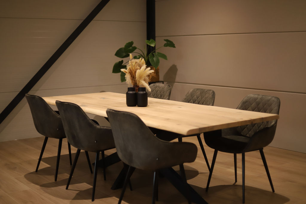 De tafel is voorzien van een zwart stalen spinpoot-onderstel in een 8×4 kokerprofiel. Dit krachtige onderstel zorgt niet alleen voor optimale stabiliteit, maar biedt ook veel beenruimte rondom de tafel. De combinatie van het warme eikenhout en het strakke stalen frame geeft de tafel een stoer en eigentijds karakter.