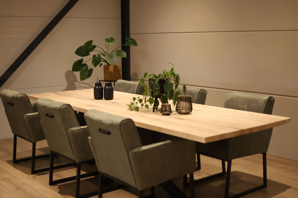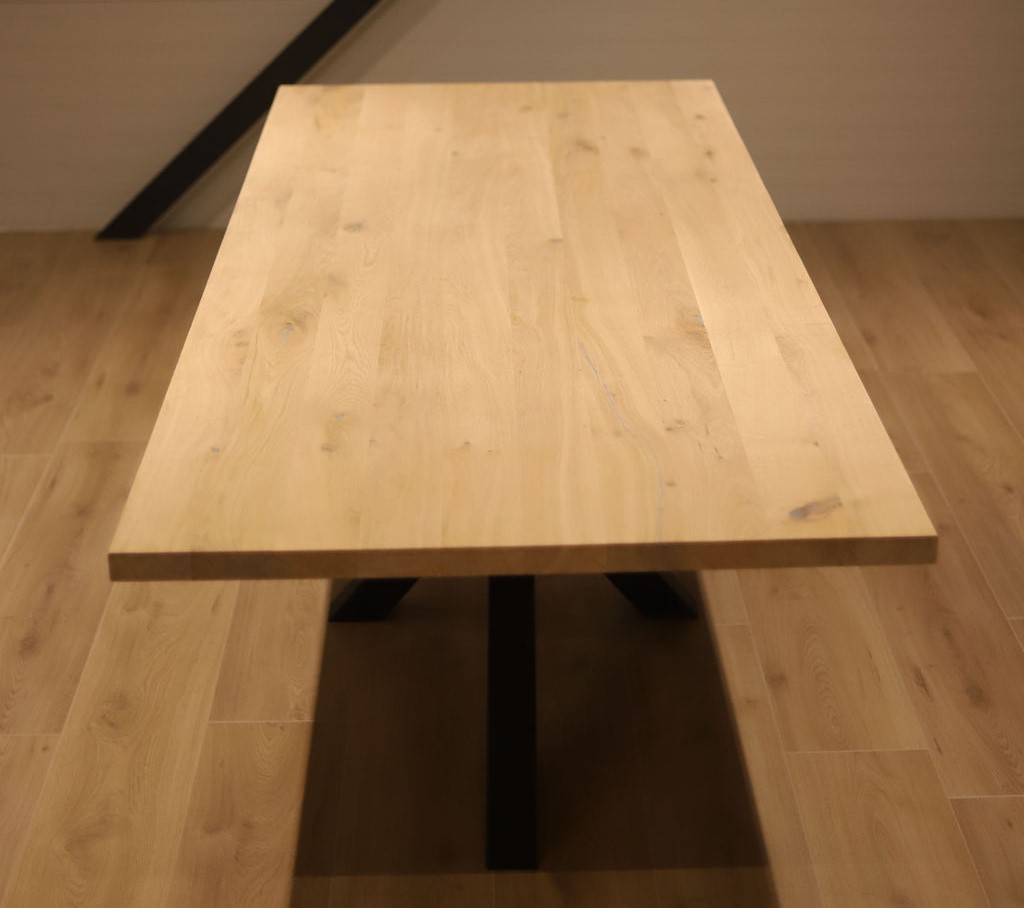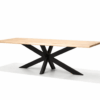 De tafel is voorzien van een zwart stalen spinpoot-onderstel in een 10 x 5 kokerprofiel. Dit onderstel zorgt niet alleen voor optimale stabiliteit, maar biedt ook veel beenruimte rondom de tafel. De combinatie van het warme eikenhout en het strakke stalen frame geeft de tafel een stoer en eigentijds karakter.