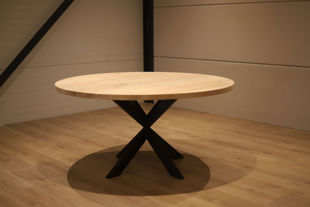 Op zoek naar een ronde eiken eettafel met een stoer industrieel onderstel? Dan is de eettafel Maro de perfecte keuze. Het massief eiken tafelblad heeft een vloeiende vorm die je interieur direct een warme en moderne uitstraling geeft. De ronde vorm zorgt bovendien voor een ruimtelijk effect en maakt het makkelijker om gezellig met iedereen aan tafel te zitten.